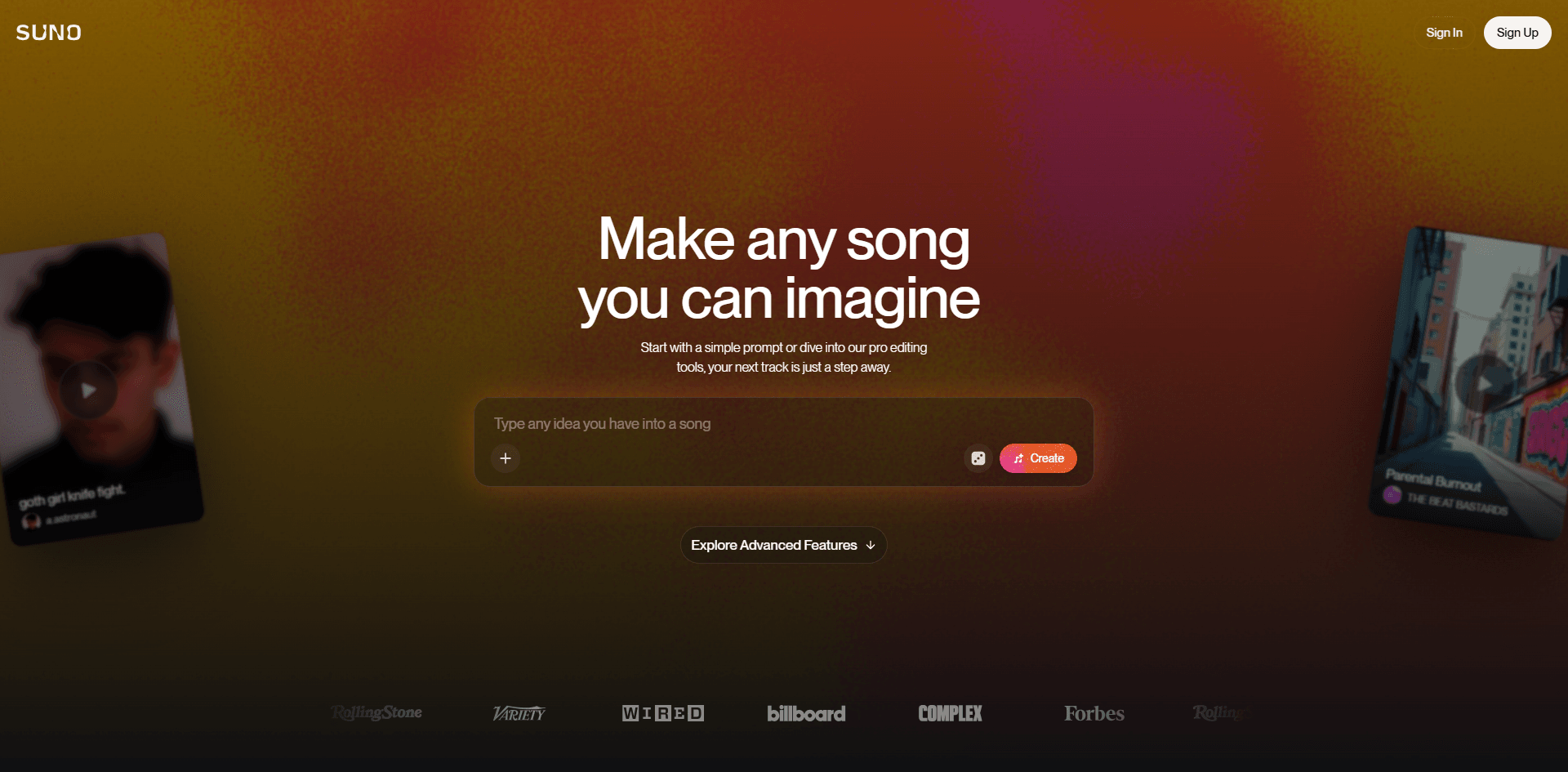 Suno doesn't just generate music it creates songs. Give it a prompt like "melancholic indie folk song about leaving your hometown" and you'll get back a fully produced track with: