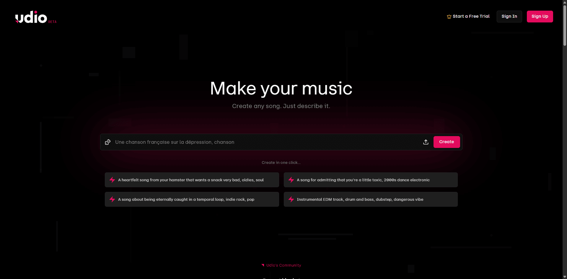 - Audio to audio remixing: Upload a voice memo or melody and let Udio build around it