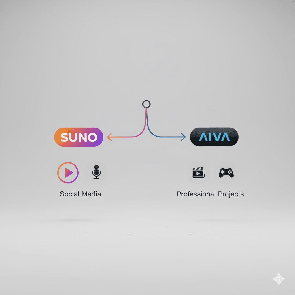 AIVA is necessary for: Anyone who needs legal clarity and full ownership. Client work, game development, library music, professional video production. The extra cost buys you peace of mind.